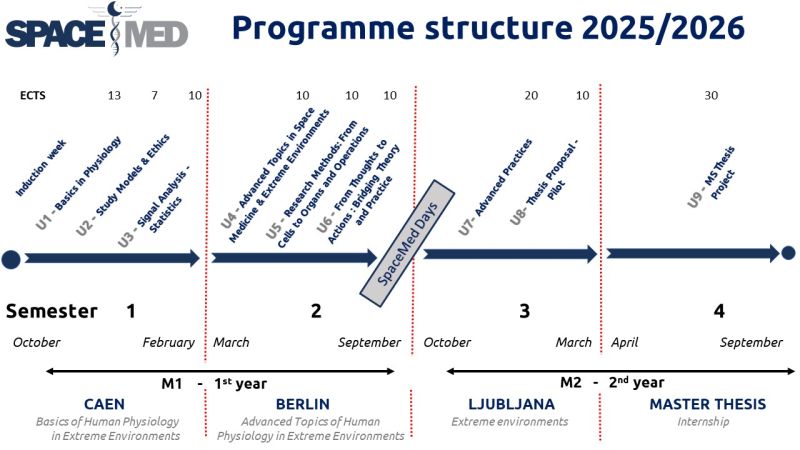 Students will spend one semester in each partner institution, i.e. in France (S1), then in Germany (S2) and finally in Slovenia (S3). Semester 4 is dedicated to the Master's Thesis. The internship can take place at one of the three Spacemed institutions, at one of the associated partners (up-to-date list on the website Associated partners), or even at external institutions.